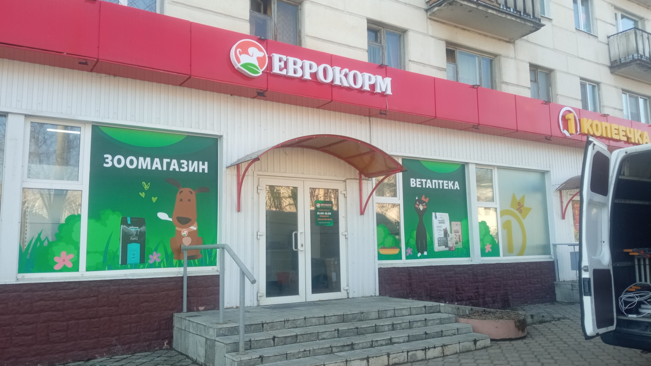 Изготовили вывеску и выполнили оформление витрин для магазина корма для животных Еврокорм