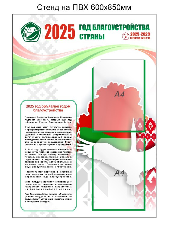 Стенд с символикой Год благоустройства 2025, пятилетка качества 2025-2029 Республики Беларусь (600х850 мм).